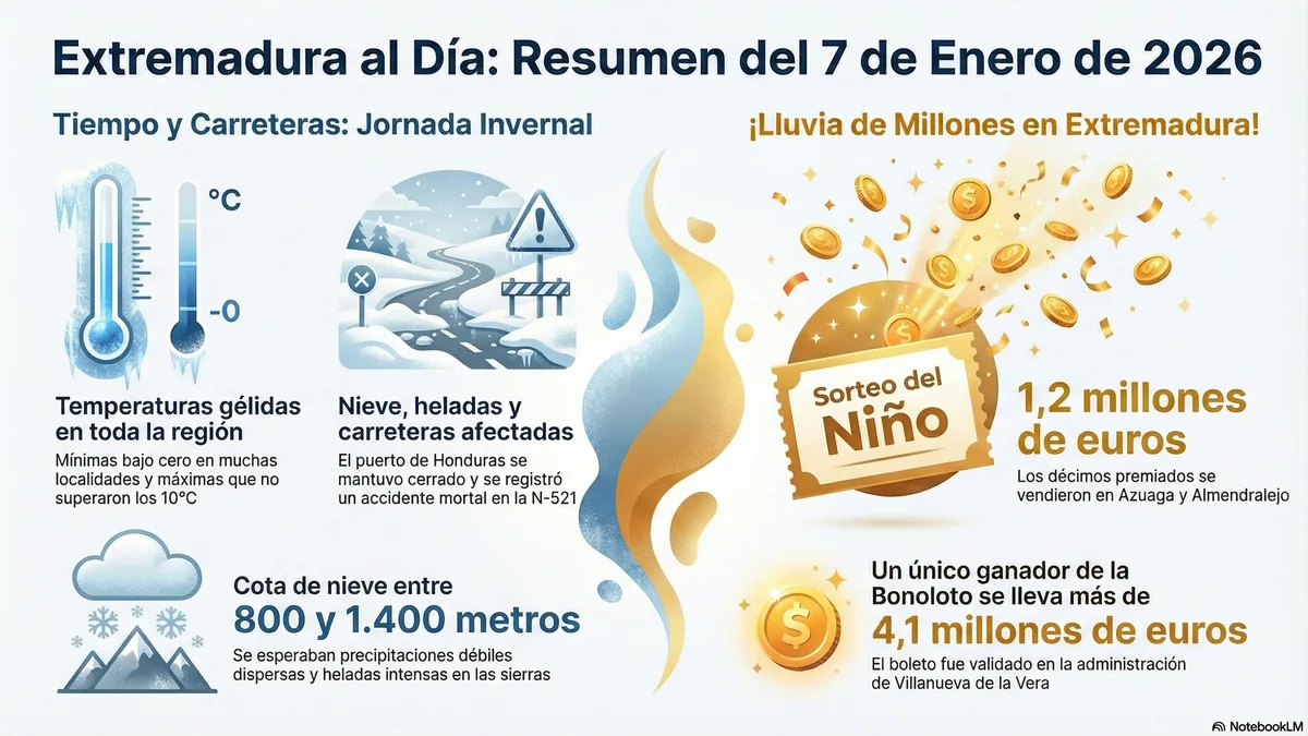¡Extremadura amanece este 7 de enero entre la suerte y la tragedia! 🗳️ Descubre quién es el nuevo millonario de la Bonoloto, los premios de El Niño, el trágico accidente en Valencia de Alcántara y la tensión política por la Asamblea. Toda la actualidad real, clara y sin filtros aquí. 🦅✨