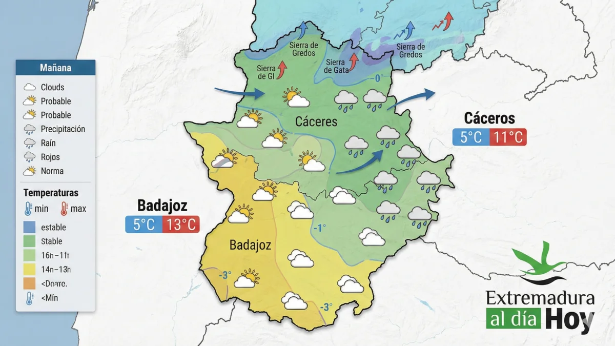 - Badajoz: Mínima de 5 °C y máxima de 13 °C.