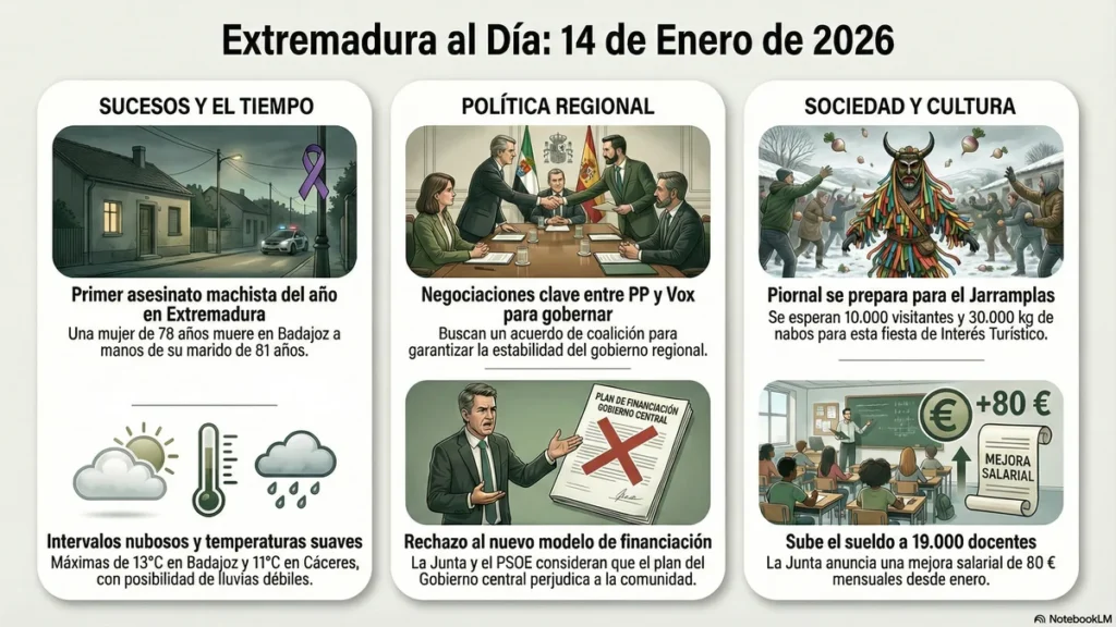 Hoy es miércoles 14 de enero de 2026, una jornada cargada de contrastes que marca el pulso de nuestra región. En Noticias Extremadura al Día – Hoy, mantenemos nuestro compromiso de ofrecerte un periodismo libre, cercano y diferente. Creemos que la información debe ser transparente y sin costes, por eso te contamos lo que ocurre en nuestra tierra con un enfoque humano y honesto. Desde el dolor por la violencia machista hasta la esperanza de nuevos proyectos tecnológicos, Extremadura se mueve y nosotros te lo contamos sin filtros.