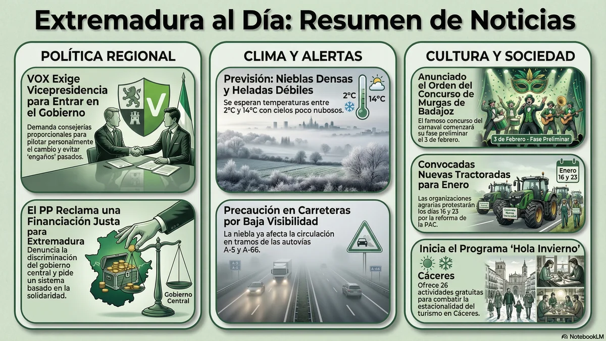 ¡Toda la actualidad de Extremadura este 11 de enero de 2026! 🦅 Alerta por nieblas densas, Abascal exige entrar en el Gobierno, el orden del Carnaval de Badajoz y el campo anuncia tractoradas. Información real, honesta y sin filtros. ✨🗳️