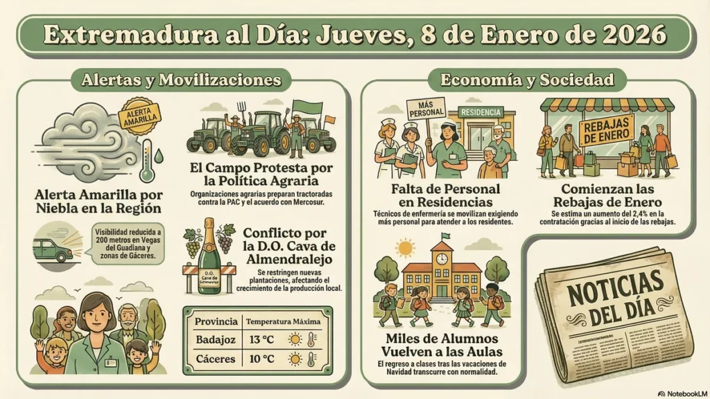 Al cerrar este 8 de enero de 2026, queda patente que Extremadura es una región que no se detiene ante las dificultades. La niebla puede nublar nuestras carreteras, pero no la voluntad de nuestros profesionales sanitarios ni la determinación de nuestros agricultores. Estamos en un momento de reajuste político y económico, donde la defensa de lo nuestro —ya sea el cava de Almendralejo o la ratio de atención en nuestras residencias— se convierte en la prioridad absoluta. La vuelta a la rutina no es solo el fin de las fiestas, sino el inicio de una lucha constante por una tierra que merece empleo digno, servicios públicos de calidad y un futuro con voz propia.