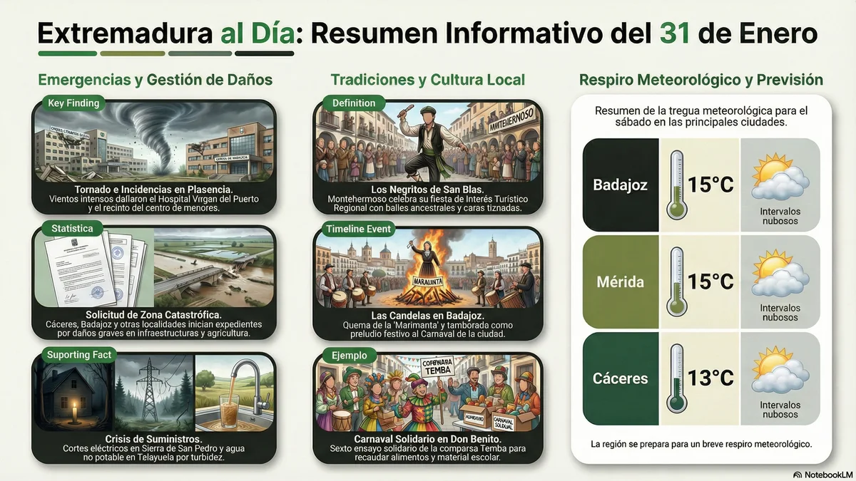 ¡Toda la actualidad de Extremadura este 31 de enero de 2026! 🦅 Analizamos los destrozos del tornado en Plasencia, las ayudas al transporte escolar de la Junta y el inicio del Carnaval en Mérida y Badajoz. Además, la previsión del tiempo y la agenda deportiva completa. ¡Información real y sin filtros! ✨🗳️