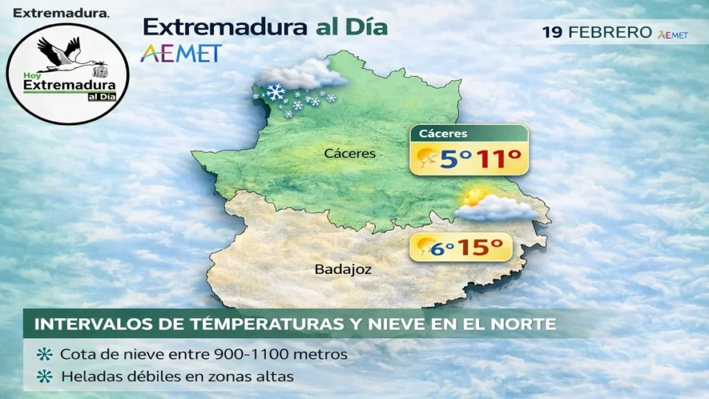 En cuanto al tiempo, para este jueves 19 de febrero, la AEMET prevé una jornada de transición. Para ser más exactos, se esperan intervalos nubosos que irán disminuyendo a lo largo del día, aunque no se descarta alguna precipitación débil en el extremo norte durante la mañana. Efectivamente, la cota de nieve se sitúa hoy entre los 900 y 1.100 metros, con heladas débiles en las cumbres más altas de la provincia de Cáceres. En relación con las temperaturas, Badajoz alcanzará una máxima de 15 °C, mientras que Cáceres se quedará en los 11 °C.