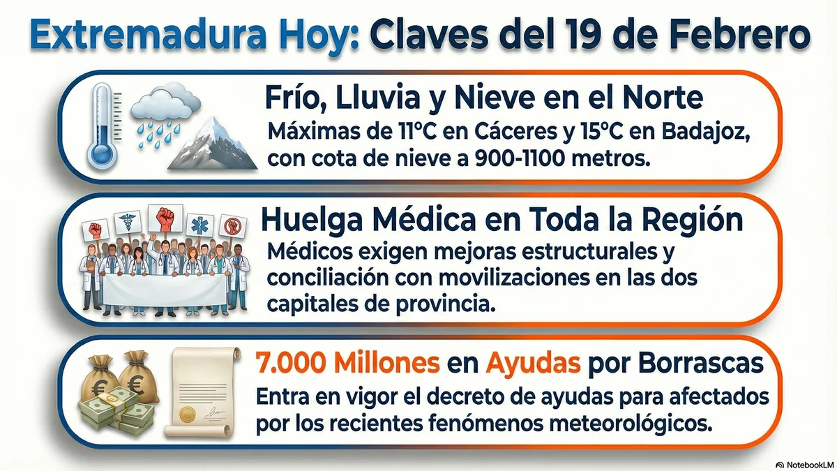 Consulta la última hora en Extremadura este jueves 19 de febrero de 2026. 🦅 Analizamos el cuarto día de huelga médica, el trágico accidente en el río Zújar, el bloqueo político por los medios públicos y las ayudas por el temporal. ¡Información real, directa y sin filtros! ✨🗳️