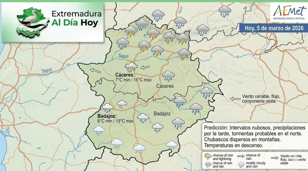 Acercándonos al final de este repaso, resulta imprescindible mirar al cielo. Según los pronósticos oficiales de la AEMET, este jueves se presenta con intervalos de nubes que irán en claro aumento. En consecuencia, durante la tarde esperamos fuertes chubascos, especialmente en el norte de la región (Cáceres), los cuales irán acompañados de tormentas eléctricas y aparato eléctrico.