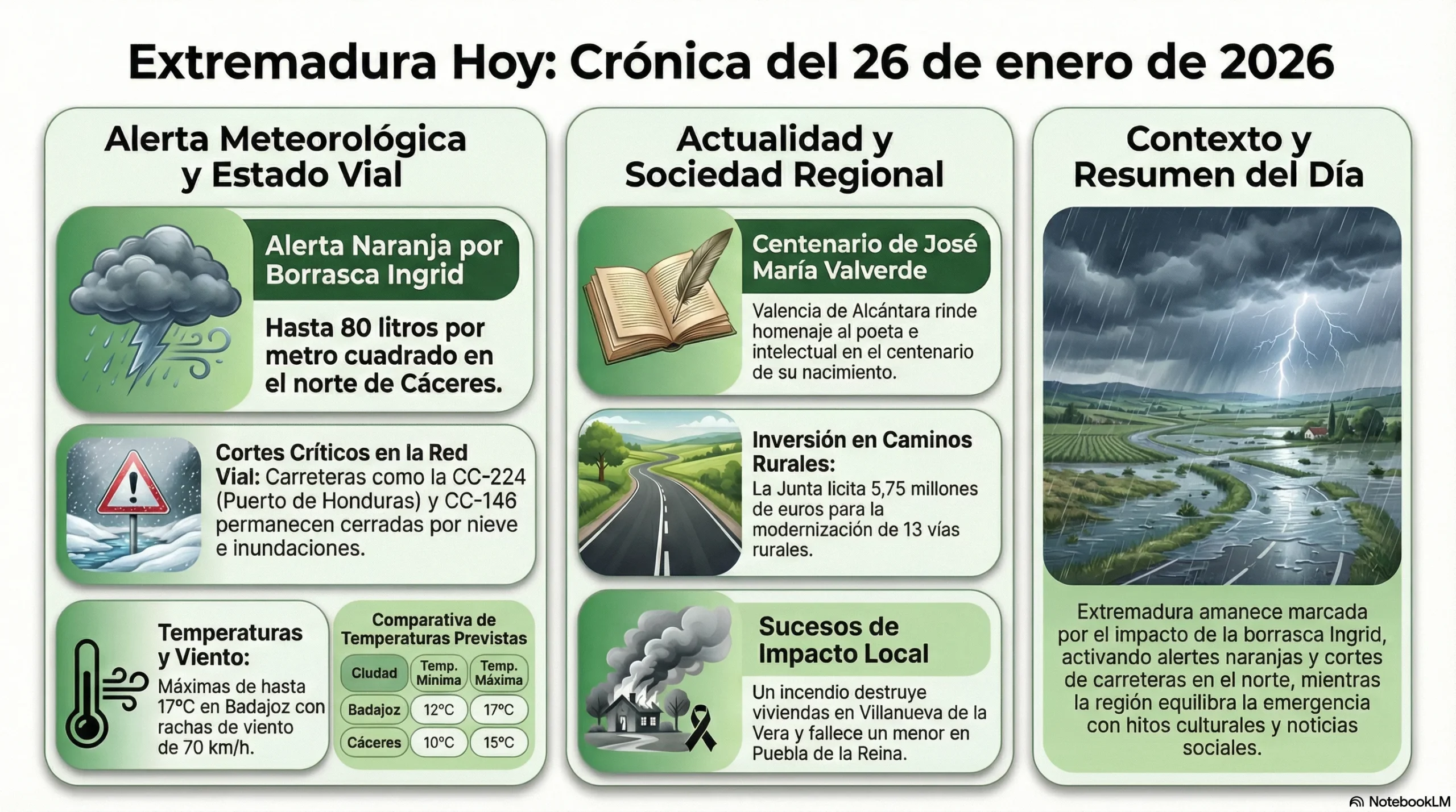 Este 26 de enero de 2026 nos presenta una radiografía fiel de la Extremadura contemporánea. Una tierra capaz de enfrentar desafíos meteorológicos extremos y gestionar el dolor de tragedias inesperadas con la solidaridad de sus vecinos y profesionales.