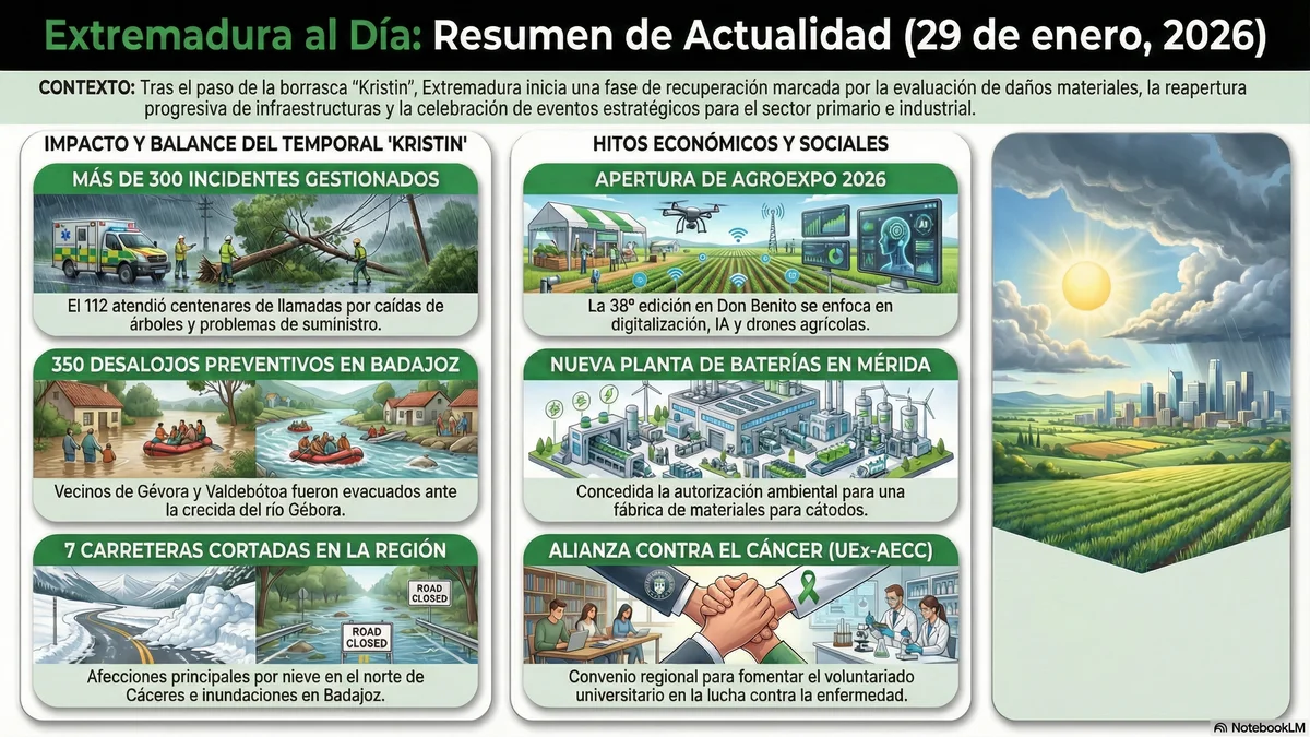 En Noticias Extremadura al Día – Hoy, mantenemos nuestra promesa de ofrecerte una información libre, cercana y diferente. Sin muros de pago y con la honestidad por bandera, abordamos este jueves 29 de enero de 2026, un día marcado por el retorno gradual a la normalidad tras el paso de la borrasca ‘Kristin’. Aunque lo peor del temporal ya ha pasado, la región amanece gestionando las consecuencias de un episodio meteorológico severo que ha dejado huella en nuestros ríos, nuestras carreteras y nuestra agenda política.