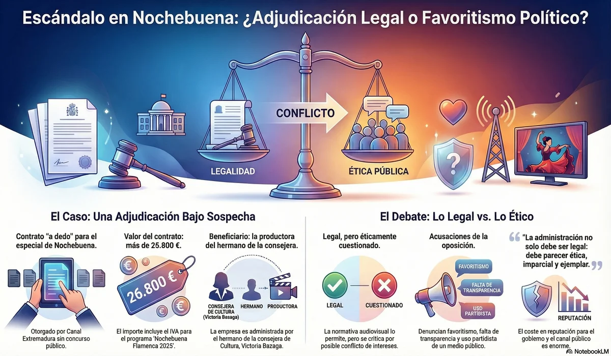 La polémica del día se centra en la adjudicación directa («a dedo») del especial “Nochebuena Flamenca 2025” de Canal Extremadura a la productora Aire de Toro Producciones. El contrato, valorado en más de 26.800 euros con IVA, ha desatado un fuerte cuestionamiento ético porque el administrador único de la empresa es el hermano de la consejera de Cultura, Victoria Bazaga. Aunque el procedimiento se ampara en la normativa audiovisual, que permite este tipo de contrataciones sin concurso público, la oposición, liderada por el PSOE extremeño, denuncia un posible conflicto de intereses y una vulneración de los principios de imparcialidad que deben regir un medio público. Este episodio reabre con fuerza el debate sobre la necesidad de mayor transparencia en la gestión de los recursos públicos en la región.