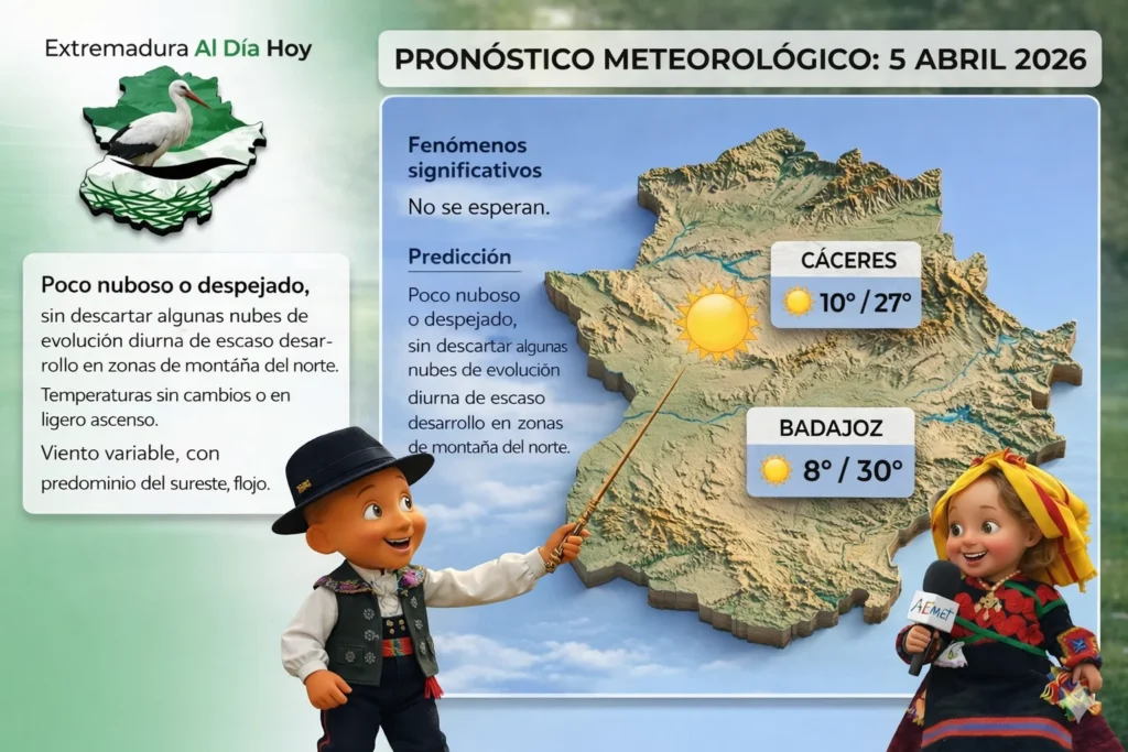 Para empezar, la jornada de este domingo, 5 de abril de 2026, amanece en nuestra comunidad autónoma repleta de un volumen informativo absolutamente extraordinario. De hecho, nos encontramos ante un día festivo donde el profundo fervor de nuestra Semana Santa se entrelaza irremediablemente con dolorosos incidentes en la naturaleza, una agenda lúdica apabullante y un clima puramente estival. Por consiguiente, a través de este minucioso análisis para nuestra redacción de Extremadura al Día Hoy —siempre bajo la atenta mirada de la emblemática cigüeña de nuestra cabecera—, vamos a desgranar cada detalle. A continuación, profundizamos en la actualidad regional con rigor, abarcando todas nuestras comarcas para que estés perfectamente informado.
