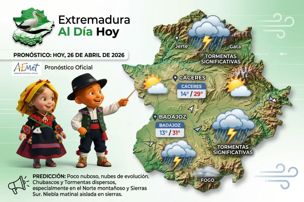 Finalmente, resulta estrictamente necesario consultar el pronóstico del tiempo para organizar correctamente nuestro domingo. De acuerdo con los datos oficiales proporcionados por la Agencia Estatal de Meteorología (AEMET), este soleado domingo 26 de abril viviremos un aumento generalizado de las temperaturas en nuestra comunidad. Ciertamente, el ambiente será inusualmente cálido para la época primaveral, alcanzando máximas sofocantes de 31 ºC en Badajoz, 30 ºC en la capital de Mérida y 29 ºC en la ciudad de Cáceres. Aunque la agradable mañana presentará cielos poco nubosos, la situación atmosférica cambiará drásticamente. En consecuencia, por la tarde crecerán fuertes nubes de evolución diurna. Por este motivo, no se descartan chubascos muy dispersos ocasionalmente acompañados de intensas tormentas, afectando principalmente al norte montañoso cacereño y a las sierras del sur pacense.