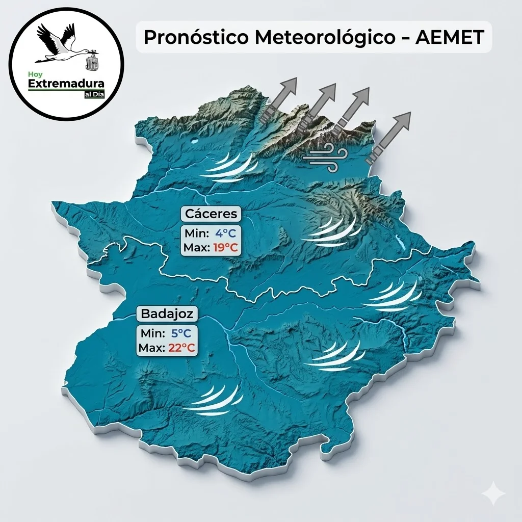 Acercándonos al final de este completo reporte informativo, es fundamental consultar la predicción del tiempo en Extremadura. De acuerdo con los datos de la Agencia Estatal de Meteorología (AEMET) reflejados en nuestro mapa regional, hoy inauguramos una semana de cielos despejados con algunas nubes altas. Por lo tanto, las temperaturas inician un claro ascenso. Específicamente, en la provincia de Badajoz alcanzaremos agradables máximas de 22ºC (con mínimas de 5ºC), mientras que en Cáceres los termómetros se situarán en los 19ºC de máxima (con 4ºC al amanecer). No obstante, los ciudadanos deben tener extrema precaución en la mitad norte y zonas montañosas cacereñas, dado que el viento del norte y noreste soplará con muchísima fuerza, avivando el citado riesgo de incendios.