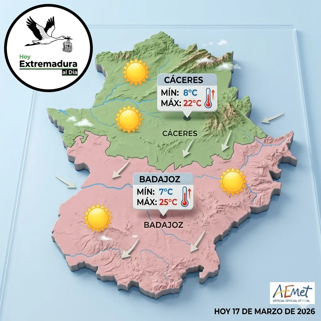 Acercándonos al final de este recorrido, es imprescindible mirar al cielo. Según las previsiones de la Agencia Estatal de Meteorología (AEMET), Extremadura disfruta hoy de un tiempo plenamente estable y primaveral. Por consiguiente, los cielos se mantendrán poco nubosos o despejados, favoreciendo un ascenso generalizado de los termómetros. En detalle, la provincia de Cáceres alcanzará una agradable máxima de 22ºC (con mínimas en torno a los 5-8ºC), mientras que en la provincia de Badajoz, y muy especialmente en las Vegas del Guadiana y Mérida, se alcanzarán los 25ºC. Todo ello acompañado de vientos muy flojos de dirección variable.