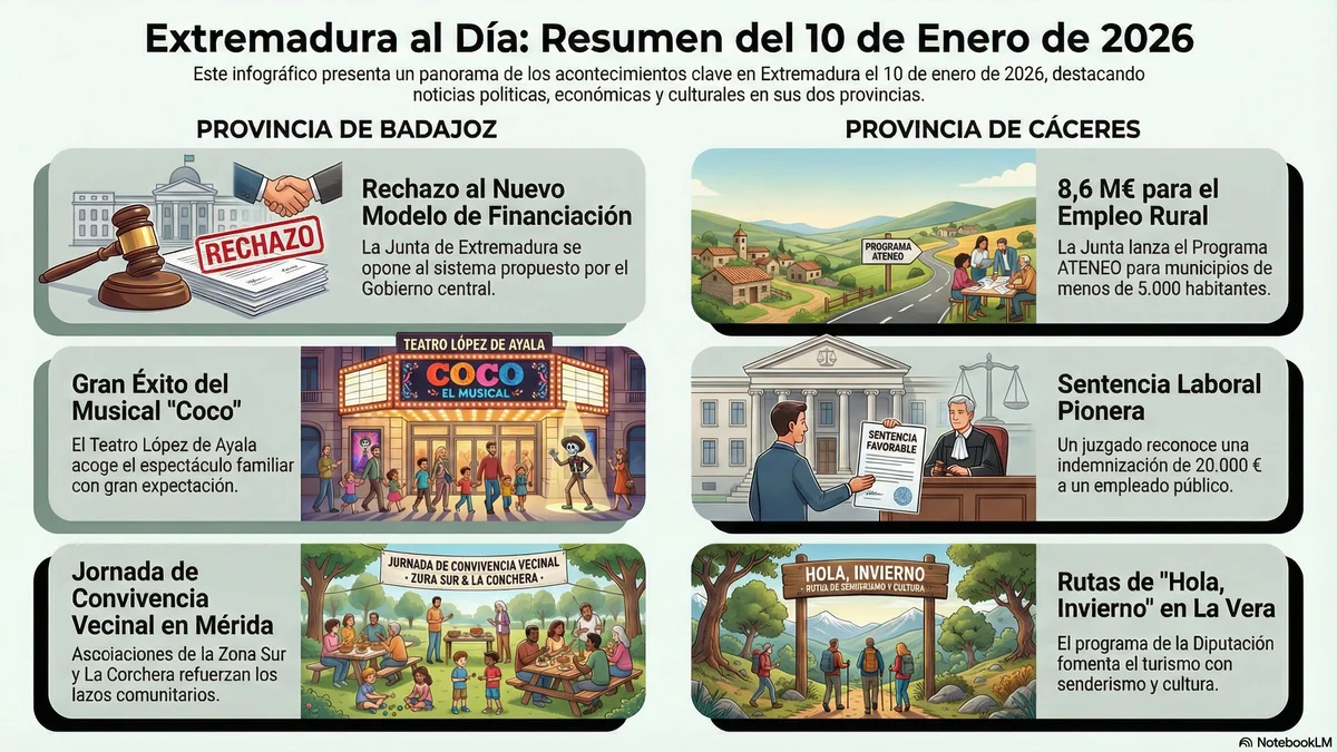 ¡Toda la actualidad de Extremadura este 10 de enero de 2026! 🦅 Descubre el rechazo de la Junta al nuevo modelo de financiación, las ayudas de 8,6M€ para pueblos pequeños, el éxito del musical Coco en Badajoz y la previsión de nieve en las cumbres. Información real, honesta y sin filtros. ✨🗳️